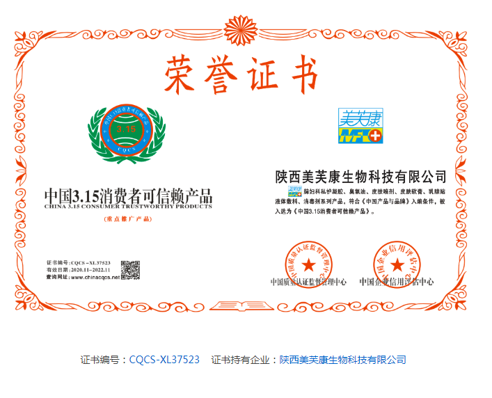陜西美芙康集團(tuán)憑借消費(fèi)者良好的口碑與認(rèn)可,于2020年12月榮獲由中國(guó)質(zhì)量認(rèn)證監(jiān)督管理中心和中國(guó)企業(yè)評(píng)估中心頒發(fā)的“中國(guó)3.15消費(fèi)者可信賴(lài)產(chǎn)品”的榮譽(yù)嘉獎(jiǎng),這是對(duì)美芙康產(chǎn)品的又一次肯定。