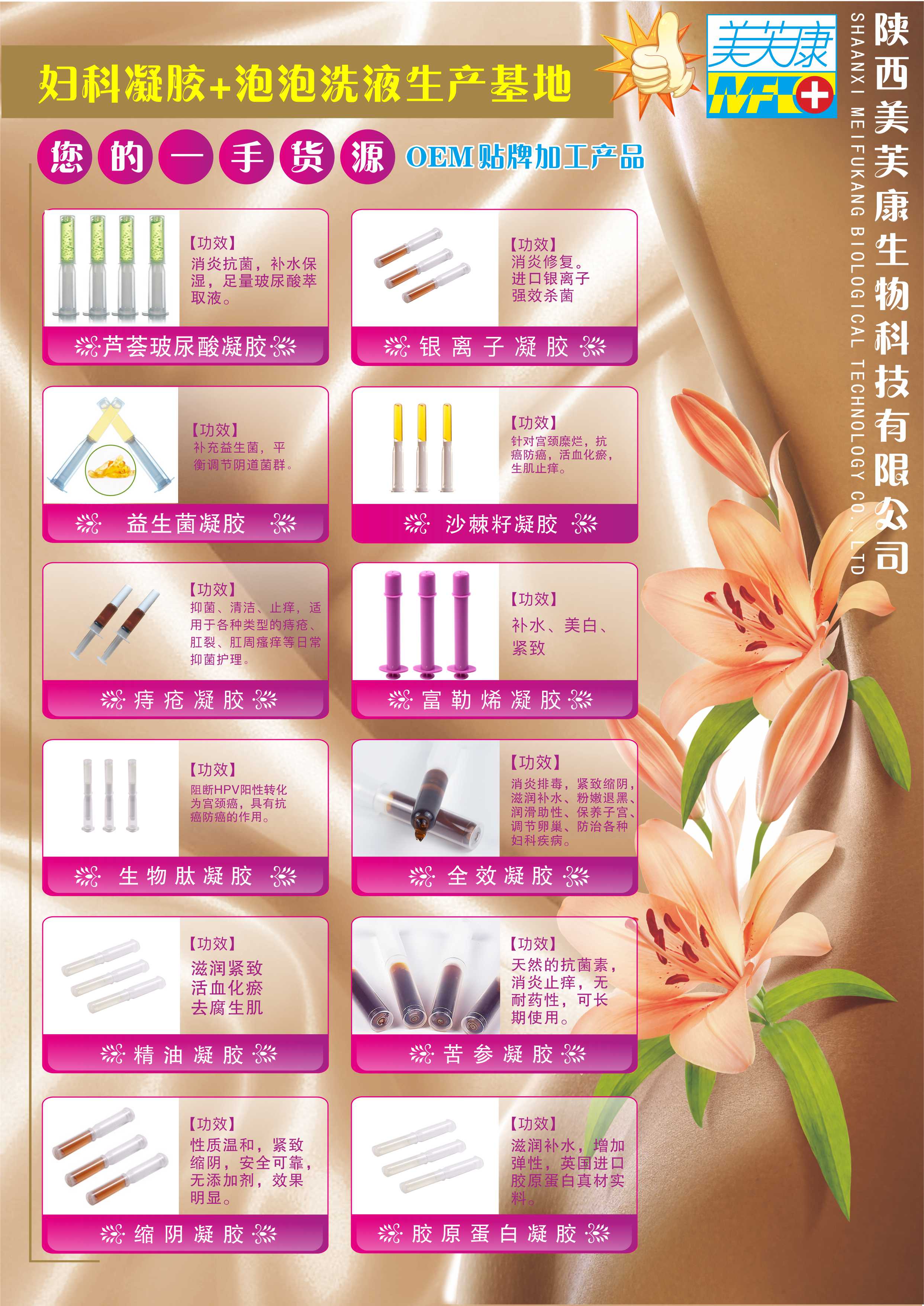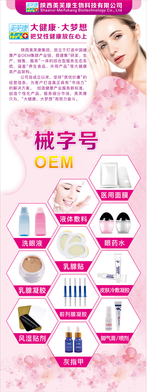 陜西美芙康生物科技有限公司是一家專注女性私護產品研發(fā)、工藝優(yōu)化、生產加工、oem/odm貼牌服務為一體的高科技生產型企業(yè)。公司擁有多名臨床醫(yī)學專家、藥學專家和生物學專家組成的研發(fā)團隊,GPM十萬級標準凈化車間,一流的生產設備,先進的生產工藝,完整科學的質量管理體系。