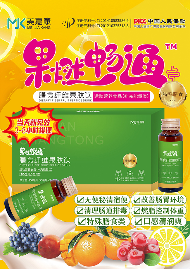 為了更好的解決廣大朋友的這一煩惱,美芙康生物經過數月研發(fā),終于研發(fā)出現一款膳食纖維果肽飲,50ml*5瓶,不僅由PICC承保,還是專利產品,能幫助維護身體平衡,守護腸道健康。